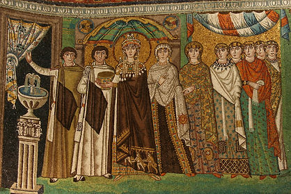 Una coppia di mosaici nella Basilica di San Vitale li raffigura in tutto lo sfarzo richiesto dal loro status sociale. Teodora è ornata da un diadema di gemme e perle, è ricoperta da un grande manto color porpora decorato sul fondo da figure di Re Magi. Avanza portando avanti un calice d’oro tempestato di gemme. E’ preceduta da due dignitari civili e seguita da uno stuolo di donne di corte.